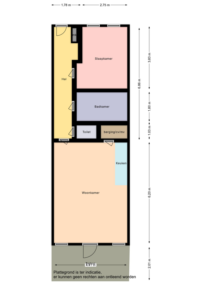 Entree tot het appartement met hal, meterkast, woonkamer met open keuken van totaal circa 26 m² voorzien van inductie kookplaat en afzuigkap. De woonkamer geeft tevens toegang tot het balkon. Slaapkamer van circa 12 m², aparte bergruimte met c.v. opstelling en badkamer met ligbad en wastafel.