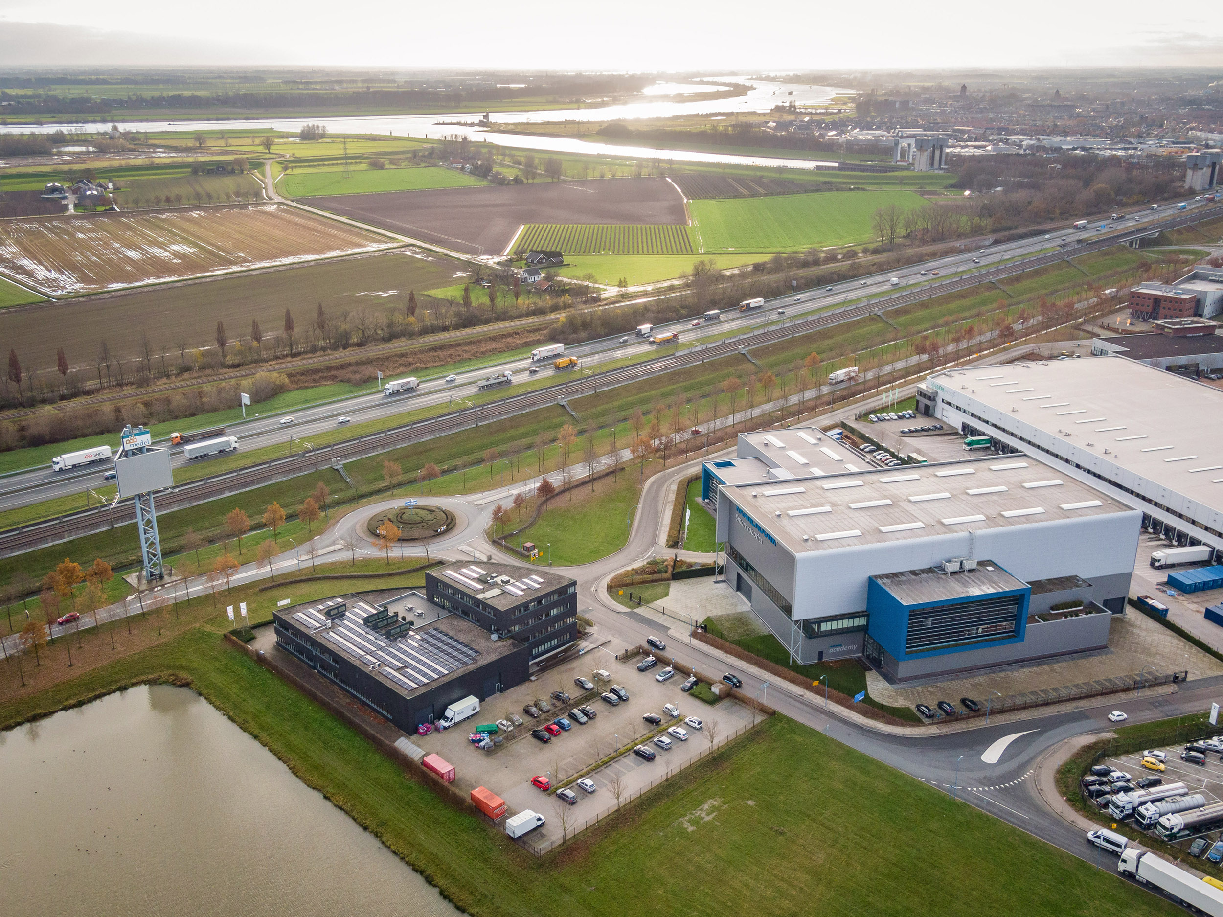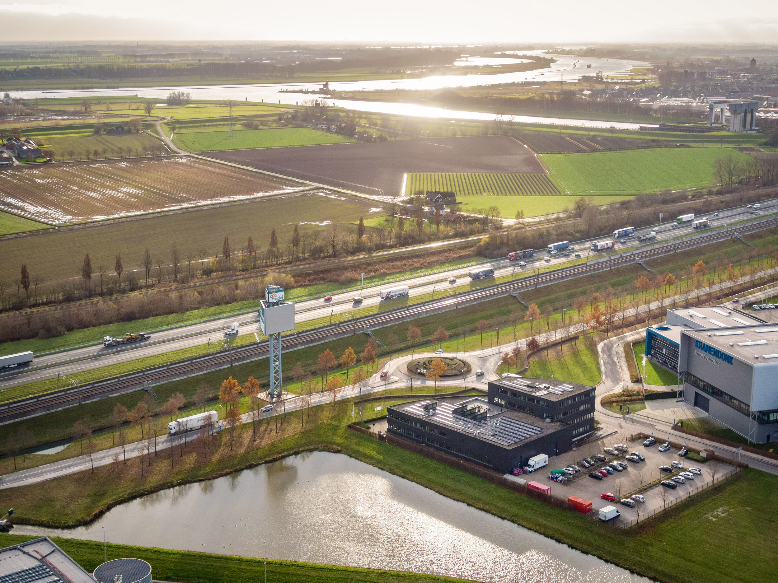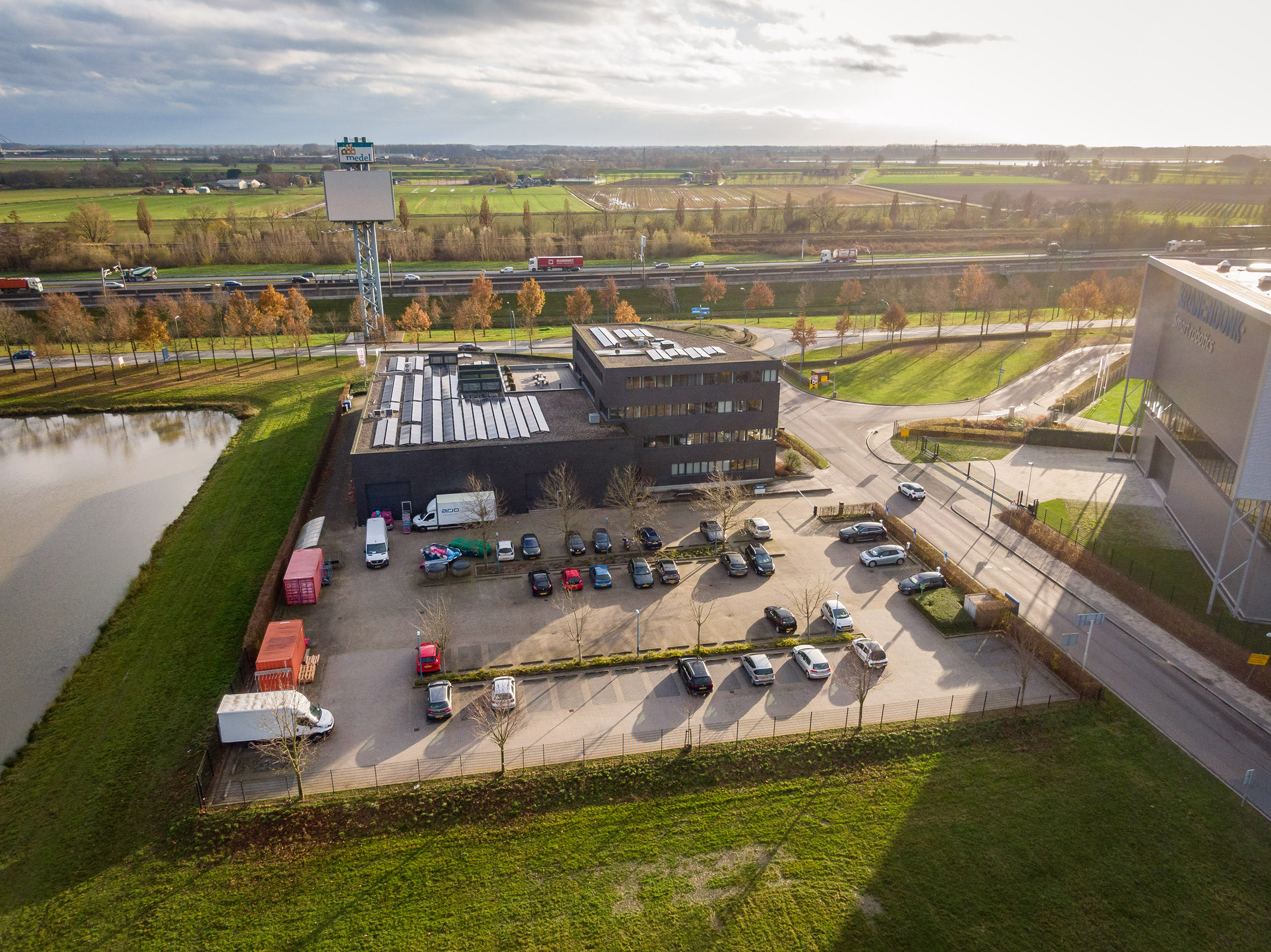 Gelegen op bedrijvenpark ‘Medel’ nabij de op- en afritten van de A15, waardoor het gemakkelijk bereikbaar is voor zowel werknemers als klanten.