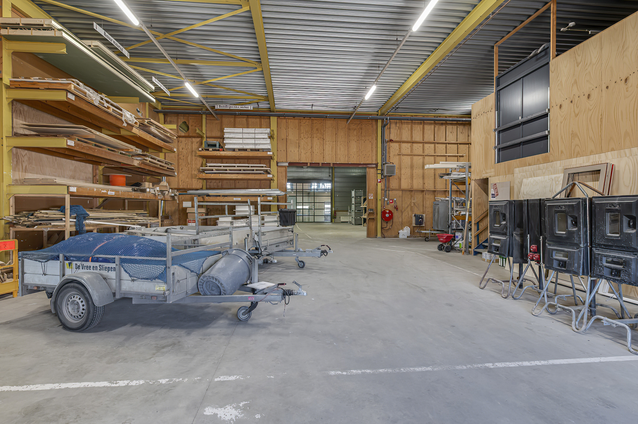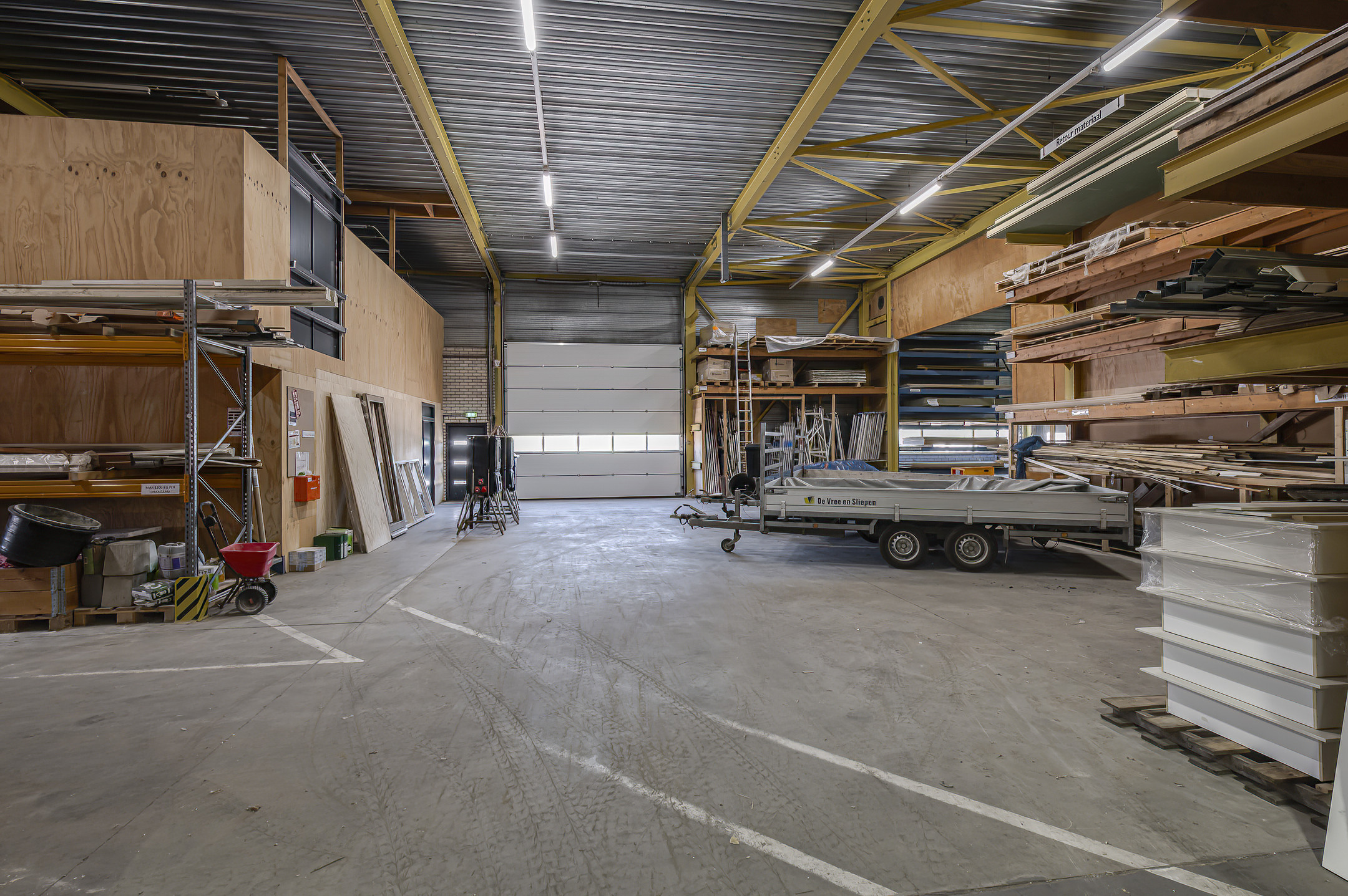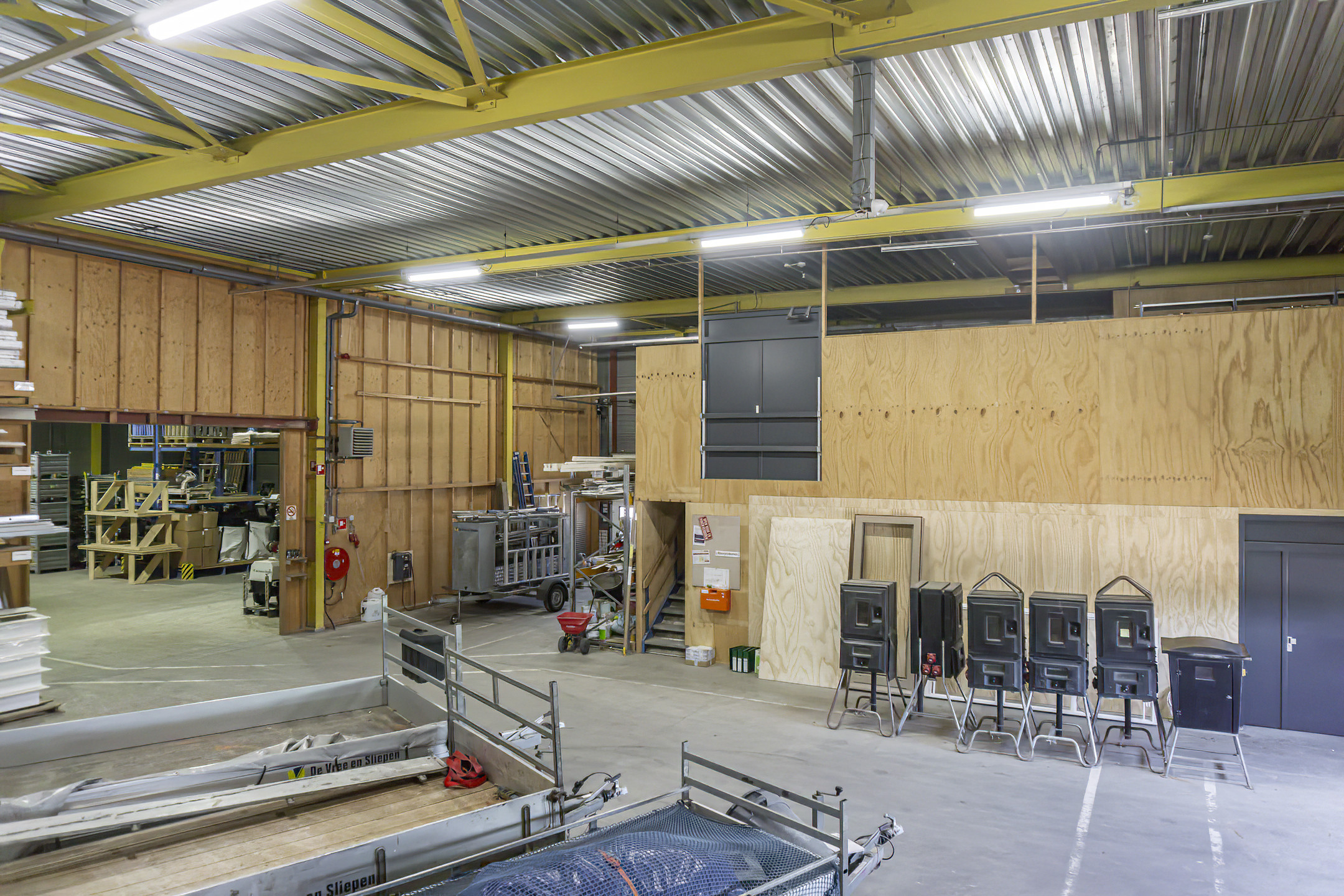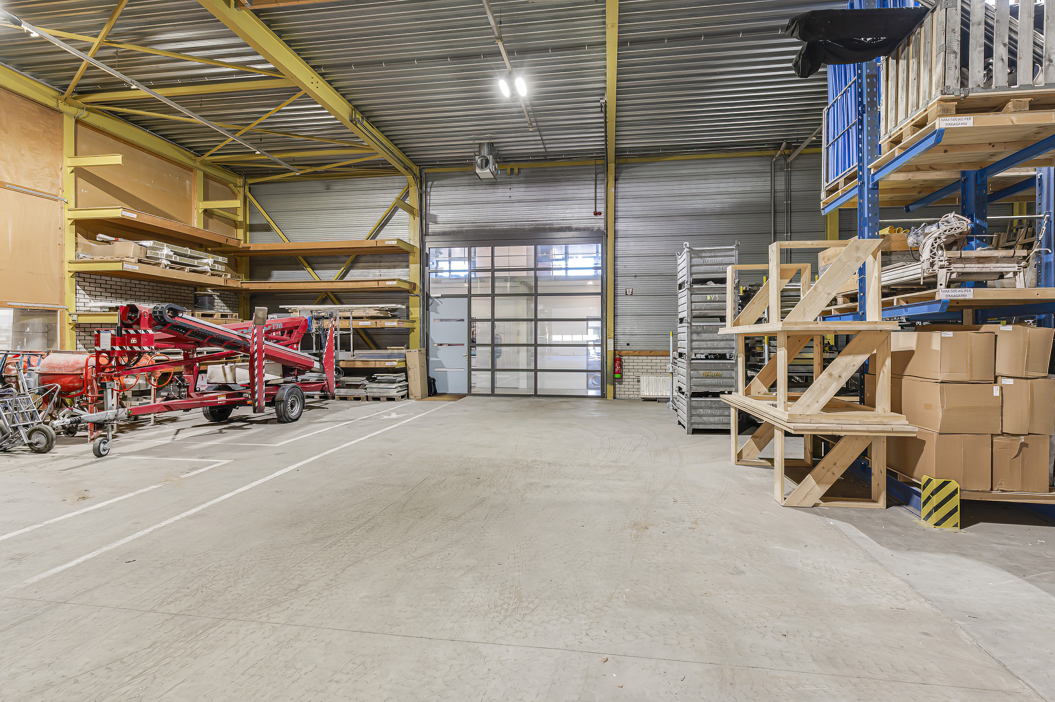 De bedrijfsruimte is verdeeld in vier compartimenten. Eén compartiment heeft een duidelijke logistieke functie en is voorzien van twee roldeuren die toegang bieden tot het zij – en het achter terrein. Twee bedrijfsruimten, tevens voorzien van 2 roldeuren, zijn in gebruik ten behoeve van assemblage activiteiten en daartoe ingericht, één ruimte is voorzien van een kantoorruimte en een opslagruimte voor toebehoren. Eén bedrijfsruimte is ingericht ten behoeve van op – en overslagactiviteiten. De compartimenten kunnen desgewenst samengevoegd worden tot een grote ruimte van 1650m2.
