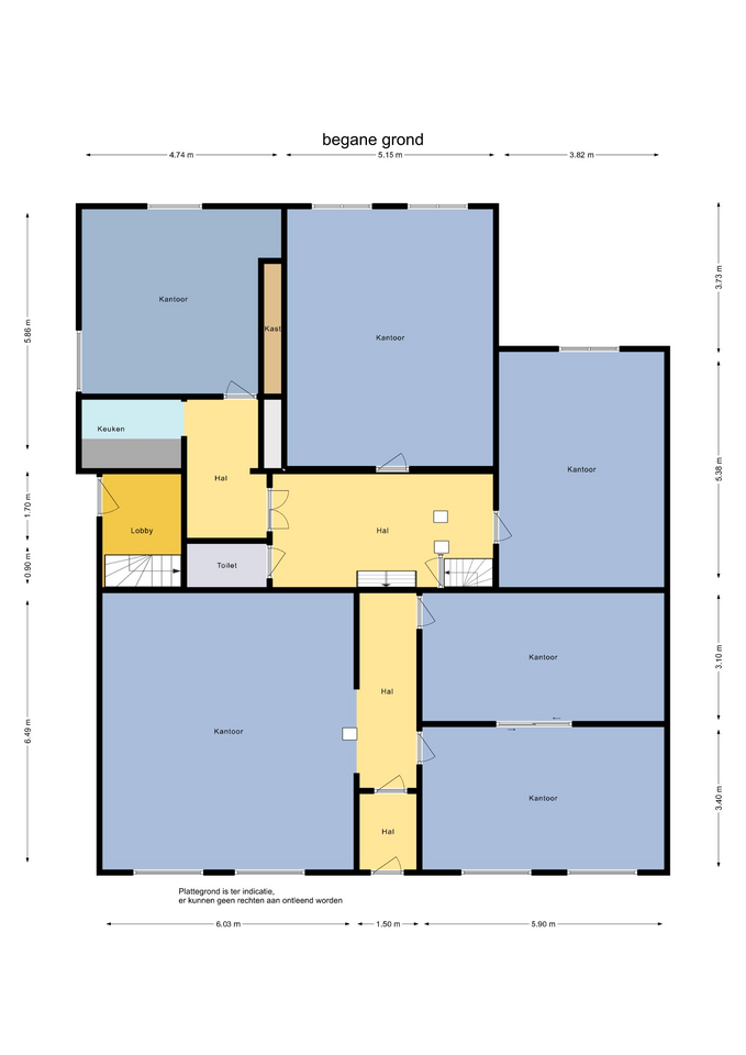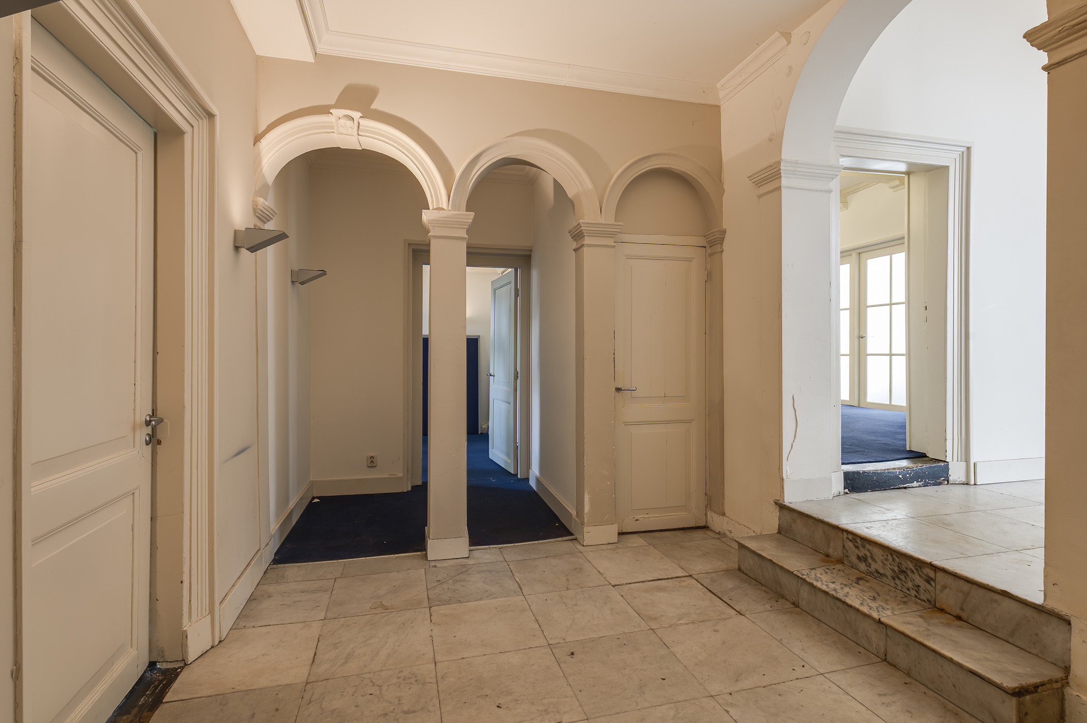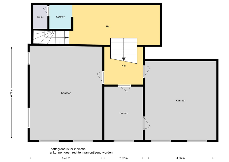 Via de representatieve entree aan de voorzijde van het pand betreedt u het tochtportaal, dat toegang biedt tot de centrale hal. Aan de linkerzijde bevindt zich een ruime, open kantoorruimte met veel mogelijkheden voor flexibel gebruik. Aan de rechterzijde treft u twee separate, afgesloten kantoorruimten.